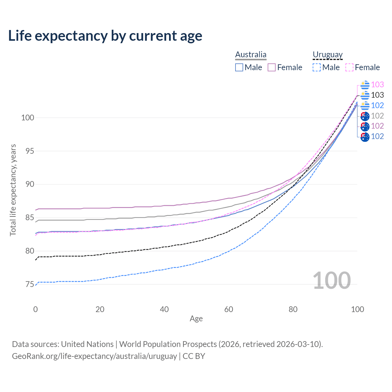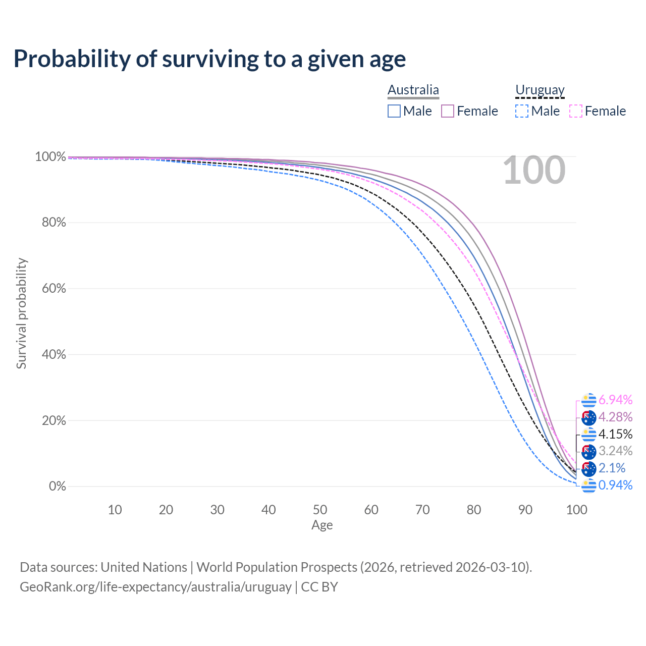 This life expectancy calculator shows the odds of living to 100, 95, 90, and below based on current age for both males and females in Australia and Uruguay, along with mean and median age of death. The calculations are based on the 2026 life tables (actuarial tables) from the UN World Population Prospects.