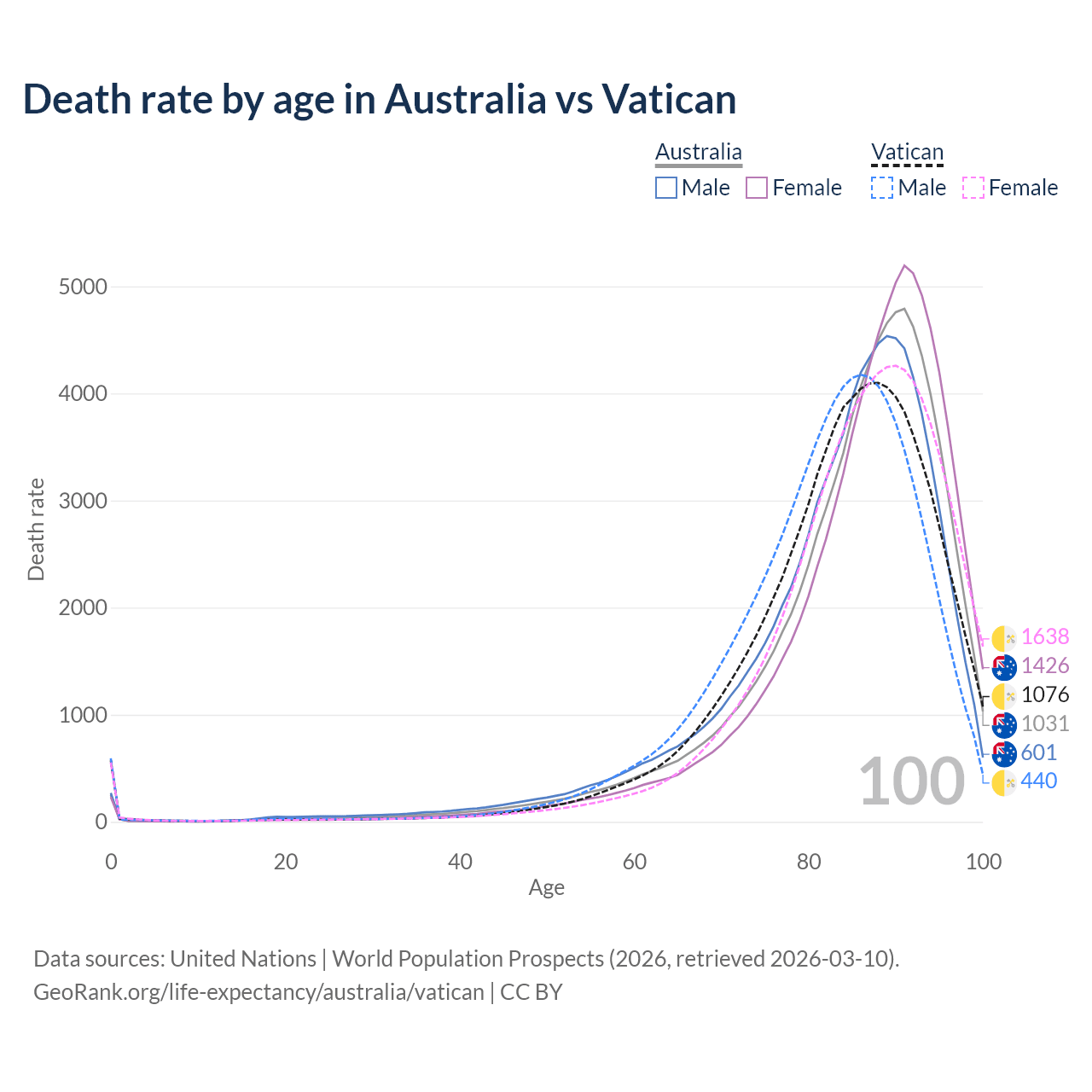 In Australia, the most common age of death is 91, compared to 88 in the Vatican. The median age of death is 87.5 in Australia and 85.7 in the Vatican, meaning only half of each cohort is expected to live past that age.