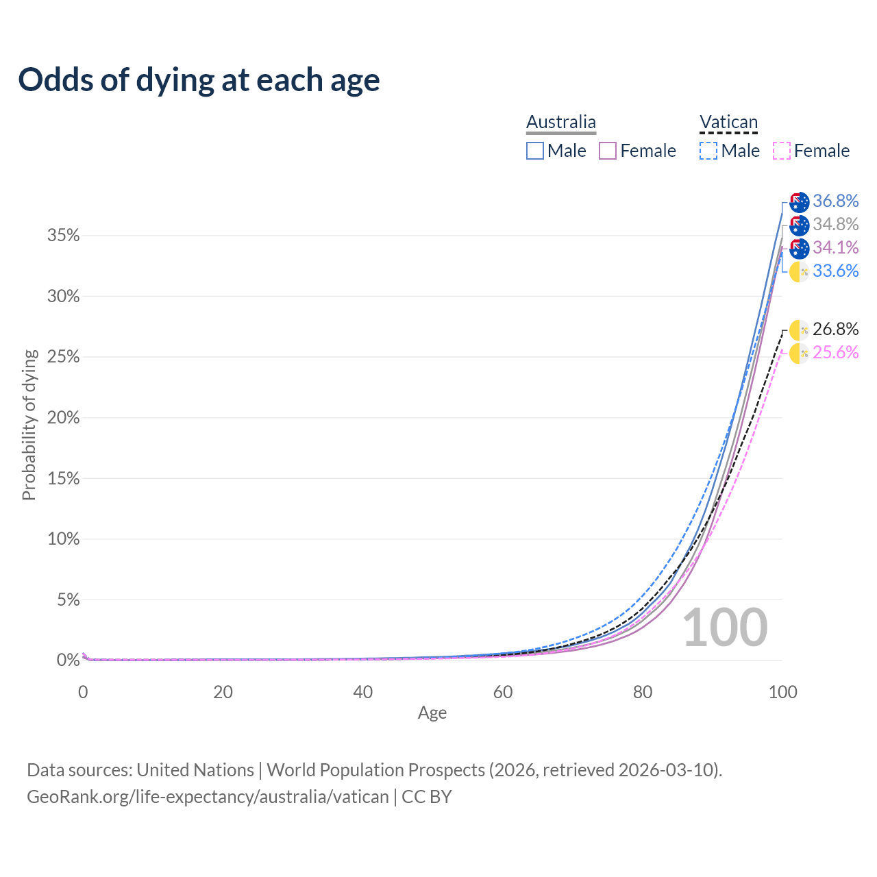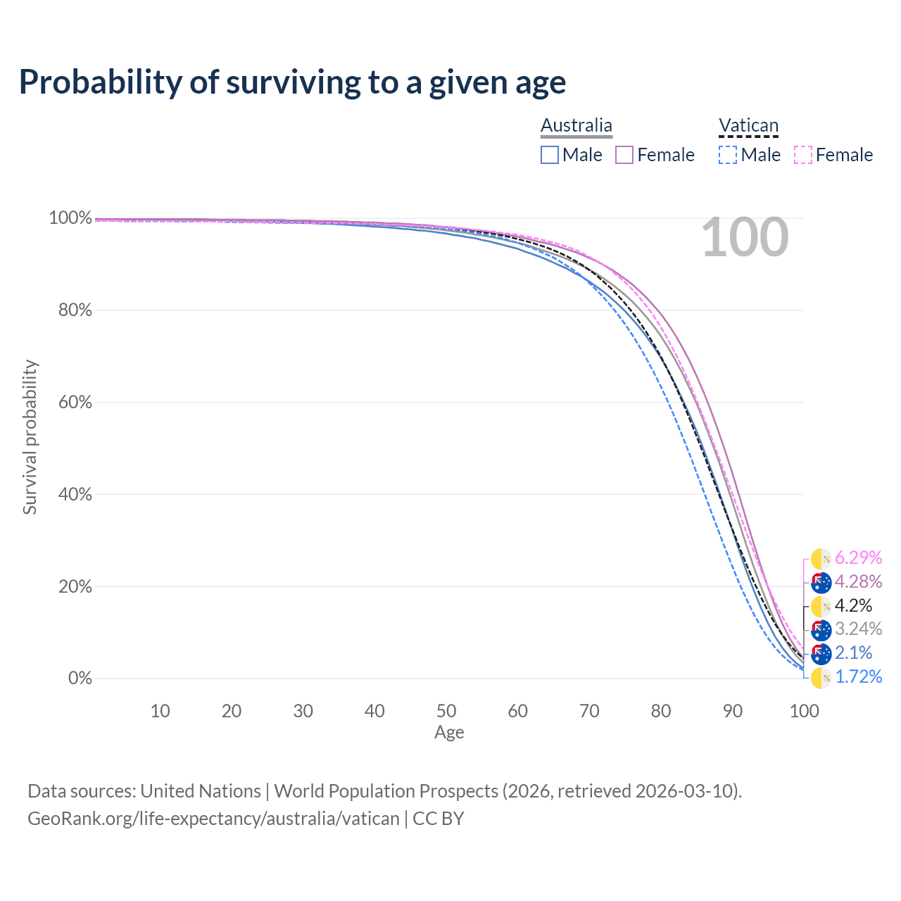 This life expectancy calculator shows the odds of living to 100, 95, 90, and below based on current age for both males and females in Australia and the Vatican, along with mean and median age of death. The calculations are based on the 2026 life tables (actuarial tables) from the UN World Population Prospects.