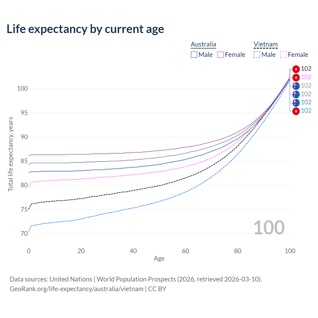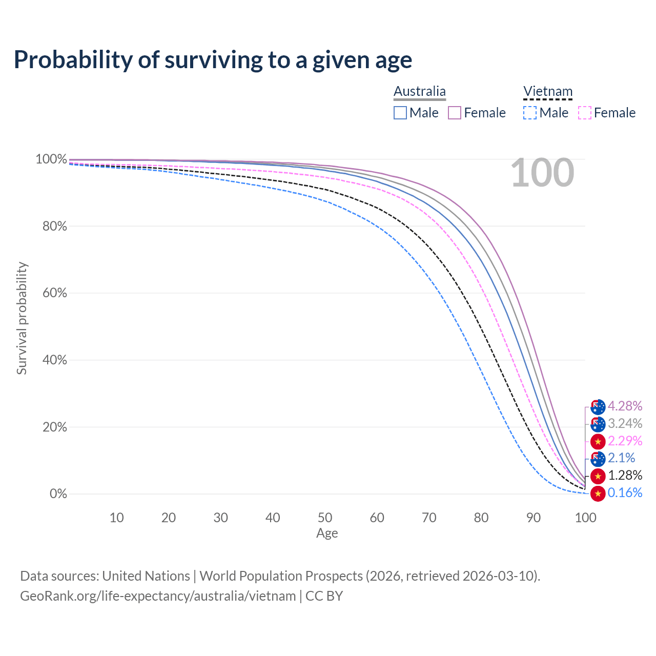 This life expectancy calculator shows the odds of living to 100, 95, 90, and below based on current age for both males and females in Australia and Vietnam, along with mean and median age of death. The calculations are based on the 2026 life tables (actuarial tables) from the UN World Population Prospects.