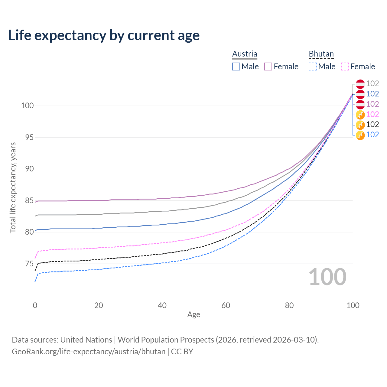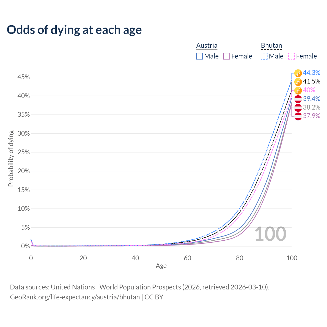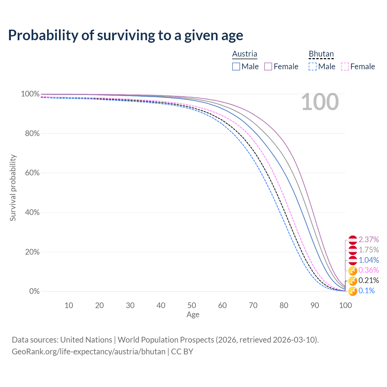 This life expectancy calculator shows the odds of living to 100, 95, 90, and below based on current age for both males and females in Austria and Bhutan, along with mean and median age of death. The calculations are based on the 2026 life tables (actuarial tables) from the UN World Population Prospects.