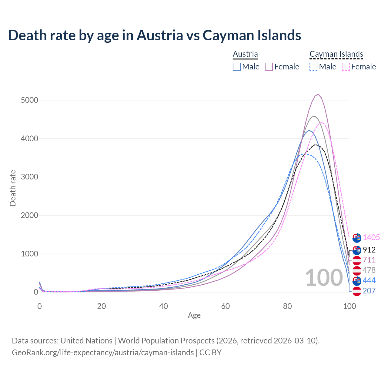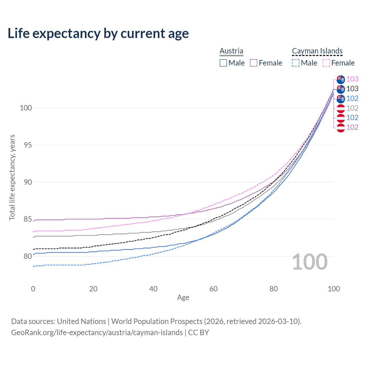 This life expectancy calculator shows the odds of living to 100, 95, 90, and below based on current age for both males and females in Austria and the Cayman Islands, along with mean and median age of death. The calculations are based on the 2026 life tables (actuarial tables) from the UN World Population Prospects.