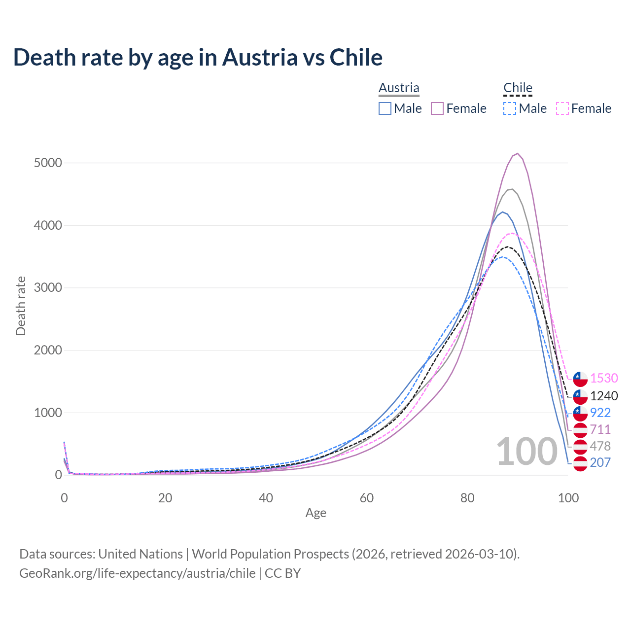 In Austria, the most common age of death is 89, compared to 88 in Chile. The median age of death is 85.6 in Austria and 84.8 in Chile, meaning only half of each cohort is expected to live past that age.