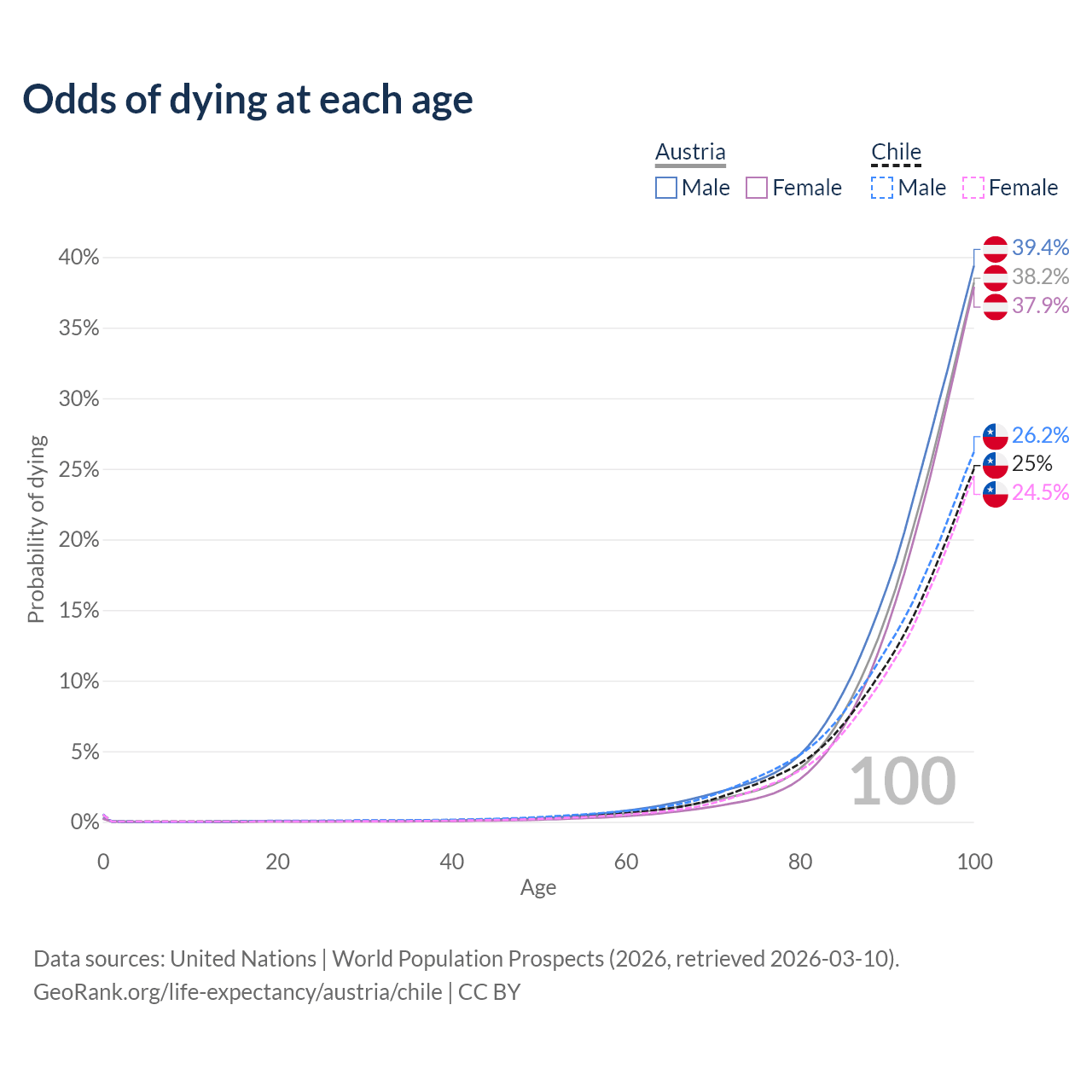 This life expectancy calculator shows the odds of living to 100, 95, 90, and below based on current age for both males and females in Austria and Chile, along with mean and median age of death. The calculations are based on the 2026 life tables (actuarial tables) from the UN World Population Prospects.