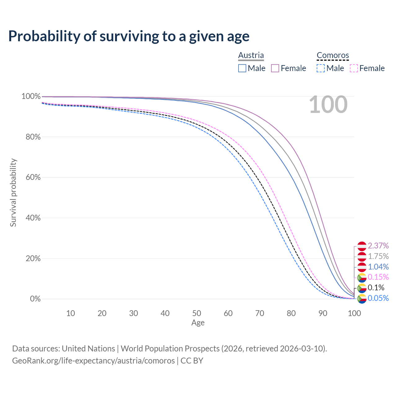 This life expectancy calculator shows the odds of living to 100, 95, 90, and below based on current age for both males and females in Austria and Comoros, along with mean and median age of death. The calculations are based on the 2026 life tables (actuarial tables) from the UN World Population Prospects.