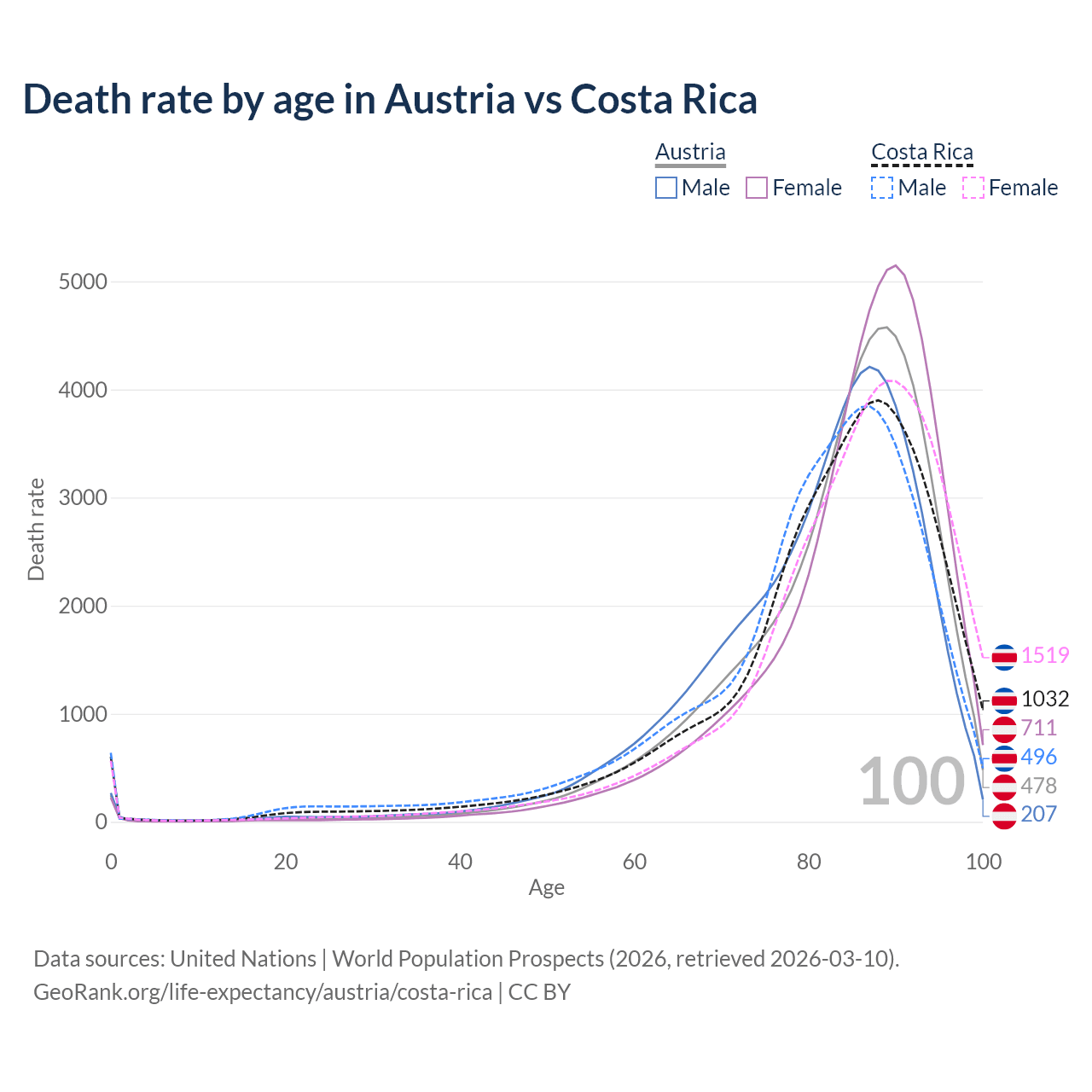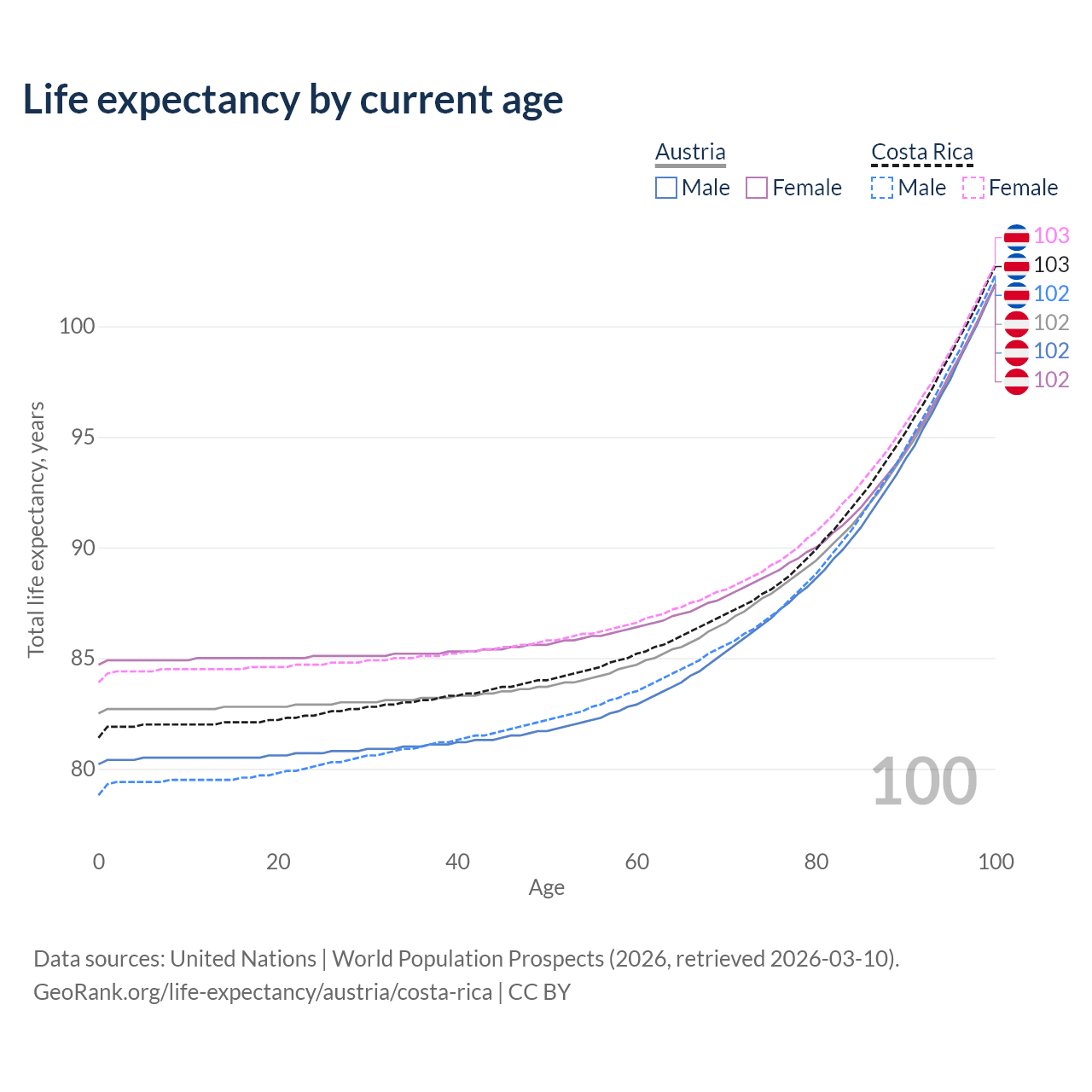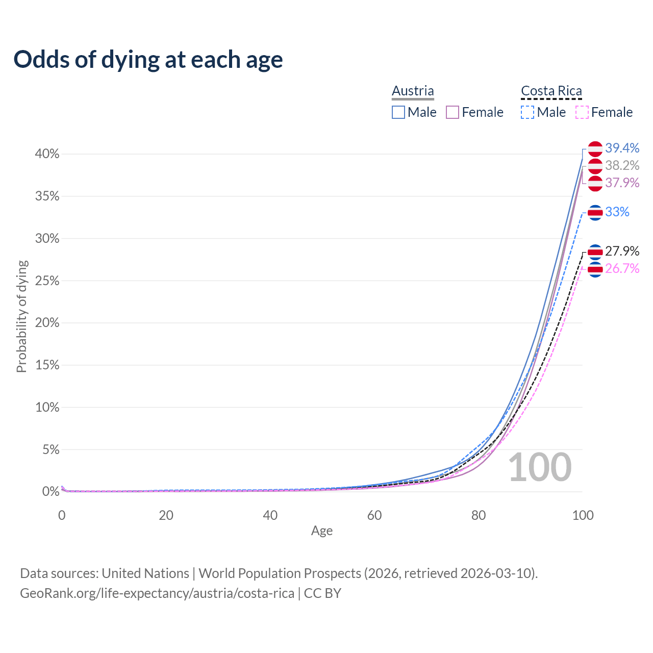 This life expectancy calculator shows the odds of living to 100, 95, 90, and below based on current age for both males and females in Austria and Costa Rica, along with mean and median age of death. The calculations are based on the 2026 life tables (actuarial tables) from the UN World Population Prospects.