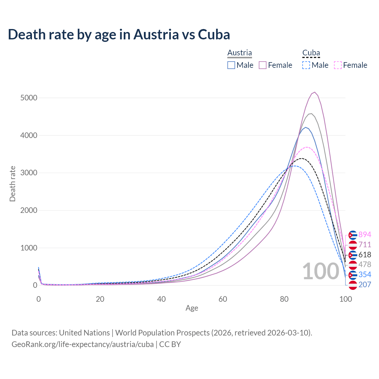 In Austria, the most common age of death is 89, compared to 86 in Cuba. The median age of death is 85.6 in Austria and 81.5 in Cuba, meaning only half of each cohort is expected to live past that age.