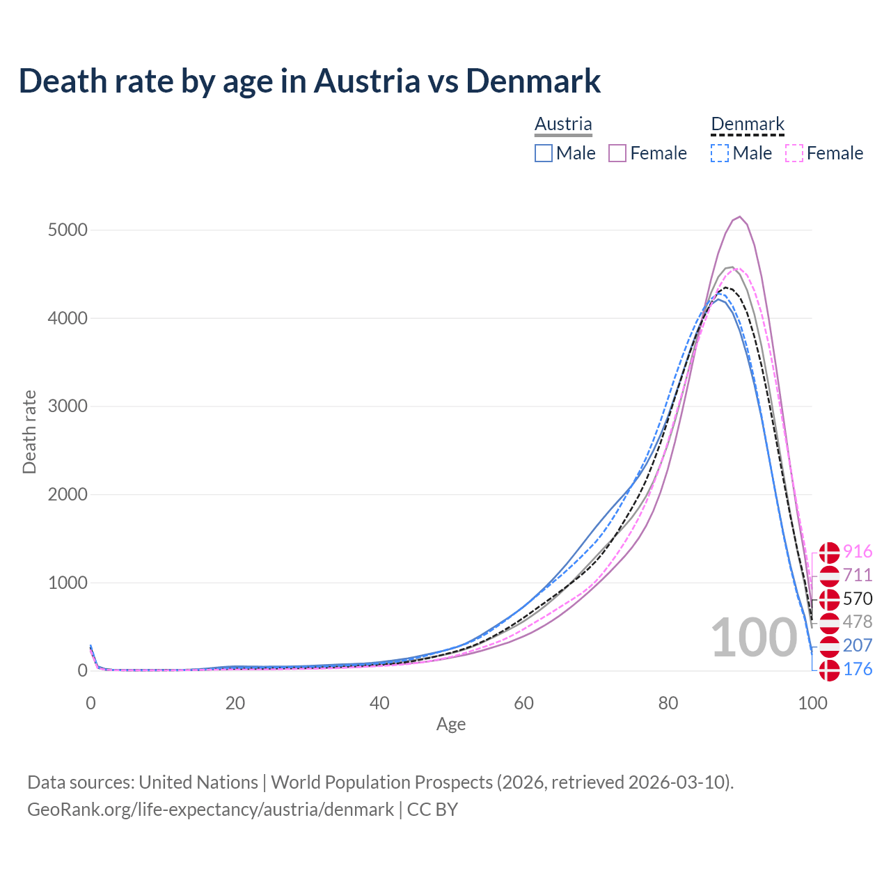 In Austria, the most common age of death is 89, compared to 88 in Denmark. The median age of death is 85.6 in Austria and 85.2 in Denmark, meaning only half of each cohort is expected to live past that age.