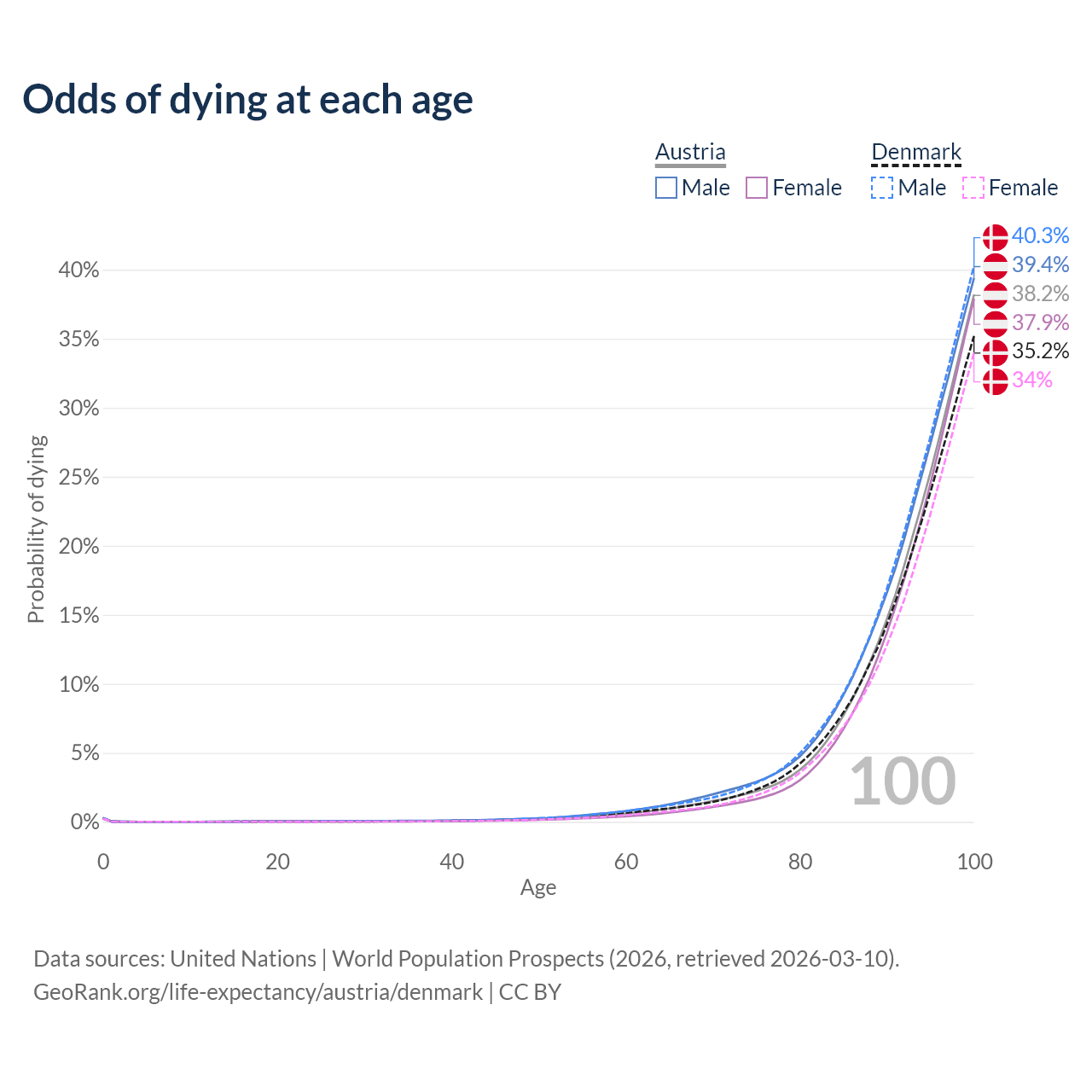 This life expectancy calculator shows the odds of living to 100, 95, 90, and below based on current age for both males and females in Austria and Denmark, along with mean and median age of death. The calculations are based on the 2026 life tables (actuarial tables) from the UN World Population Prospects.