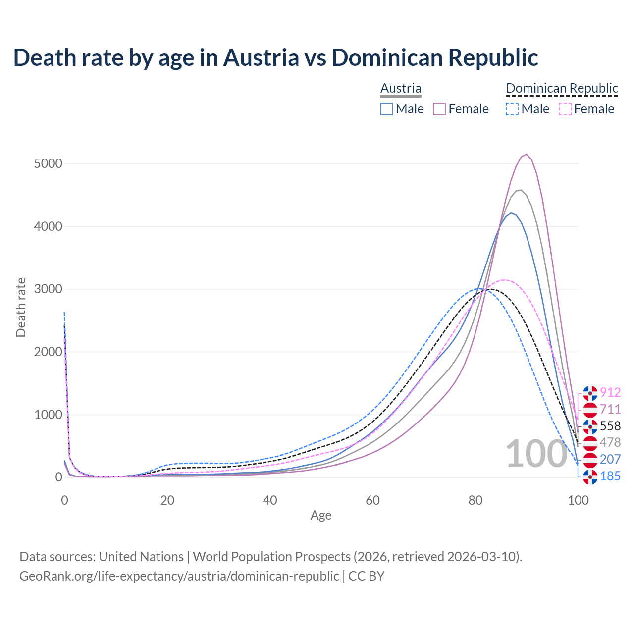 In Austria, the most common age of death is 89, compared to 83 in the Dominican Republic. The median age of death is 85.6 in Austria and 78.9 in the Dominican Republic, meaning only half of each cohort is expected to live past that age.