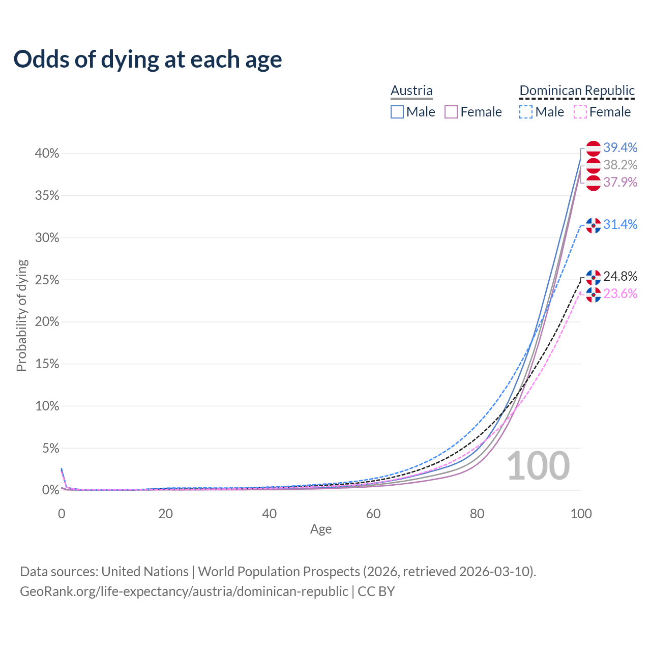This life expectancy calculator shows the odds of living to 100, 95, 90, and below based on current age for both males and females in Austria and the Dominican Republic, along with mean and median age of death. The calculations are based on the 2026 life tables (actuarial tables) from the UN World Population Prospects.