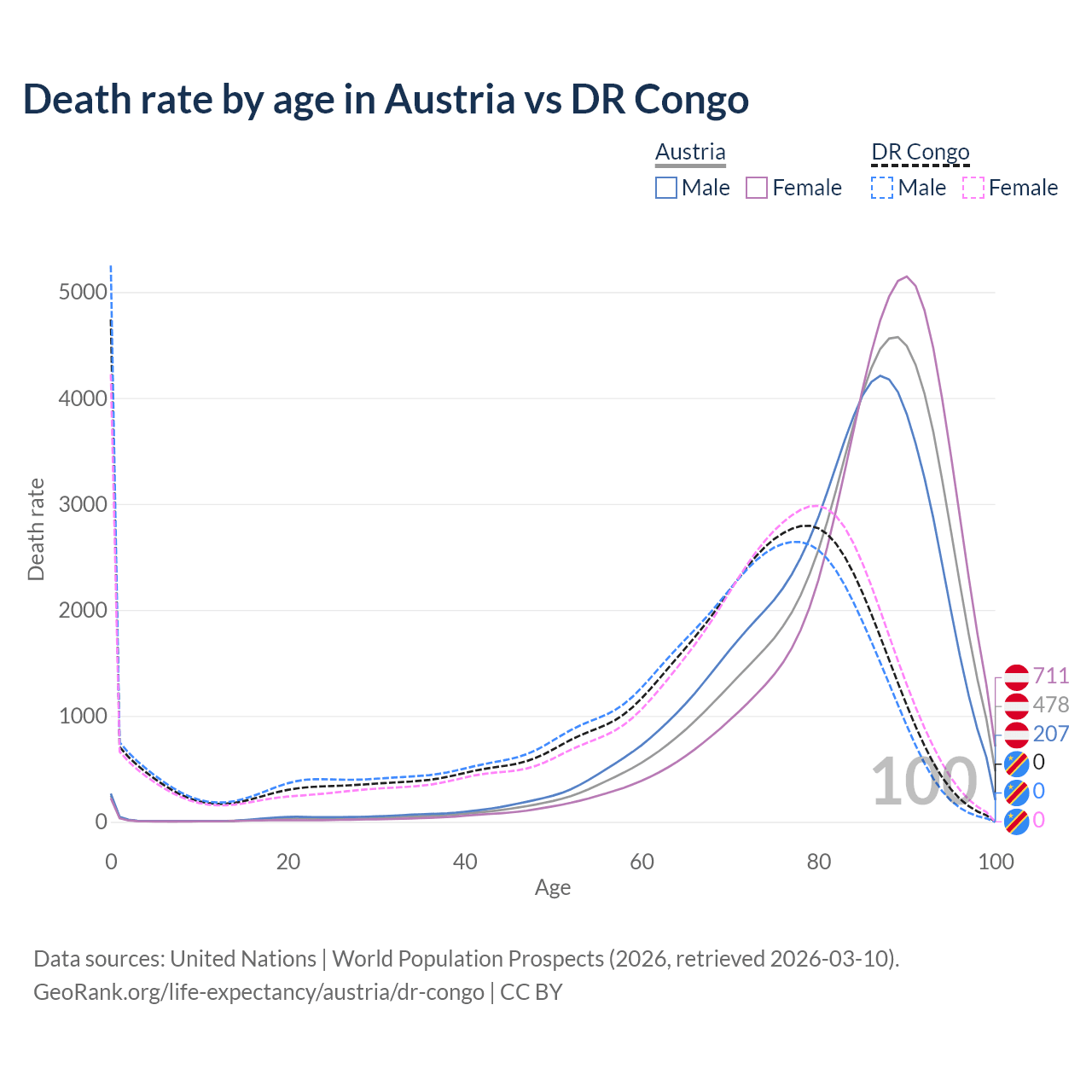 In Austria, the most common age of death is 89, compared to 0 in the DR Congo. The median age of death is 85.6 in Austria and 70.9 in the DR Congo, meaning only half of each cohort is expected to live past that age.