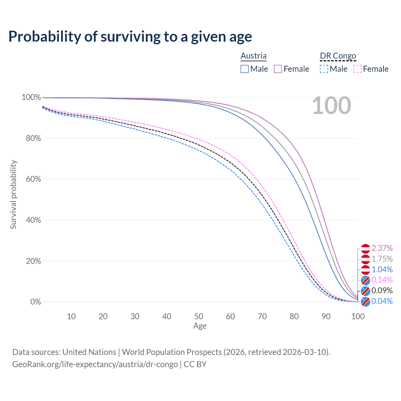 This life expectancy calculator shows the odds of living to 100, 95, 90, and below based on current age for both males and females in Austria and the DR Congo, along with mean and median age of death. The calculations are based on the 2026 life tables (actuarial tables) from the UN World Population Prospects.