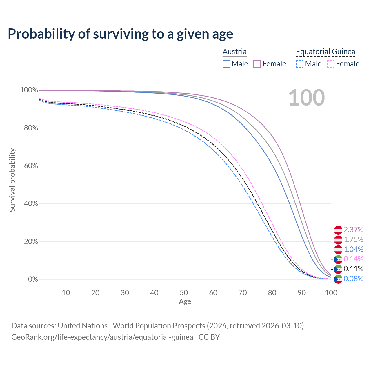 This life expectancy calculator shows the odds of living to 100, 95, 90, and below based on current age for both males and females in Austria and Equatorial Guinea, along with mean and median age of death. The calculations are based on the 2026 life tables (actuarial tables) from the UN World Population Prospects.