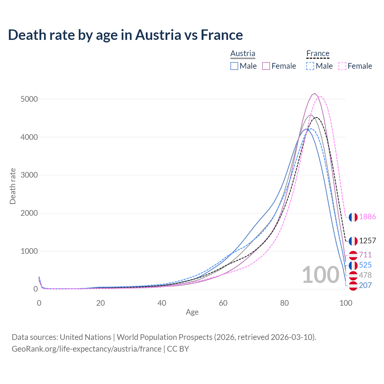In Austria, the most common age of death is 89, compared to 90 in France. The median age of death is 85.6 in Austria and 87.4 in France, meaning only half of each cohort is expected to live past that age.