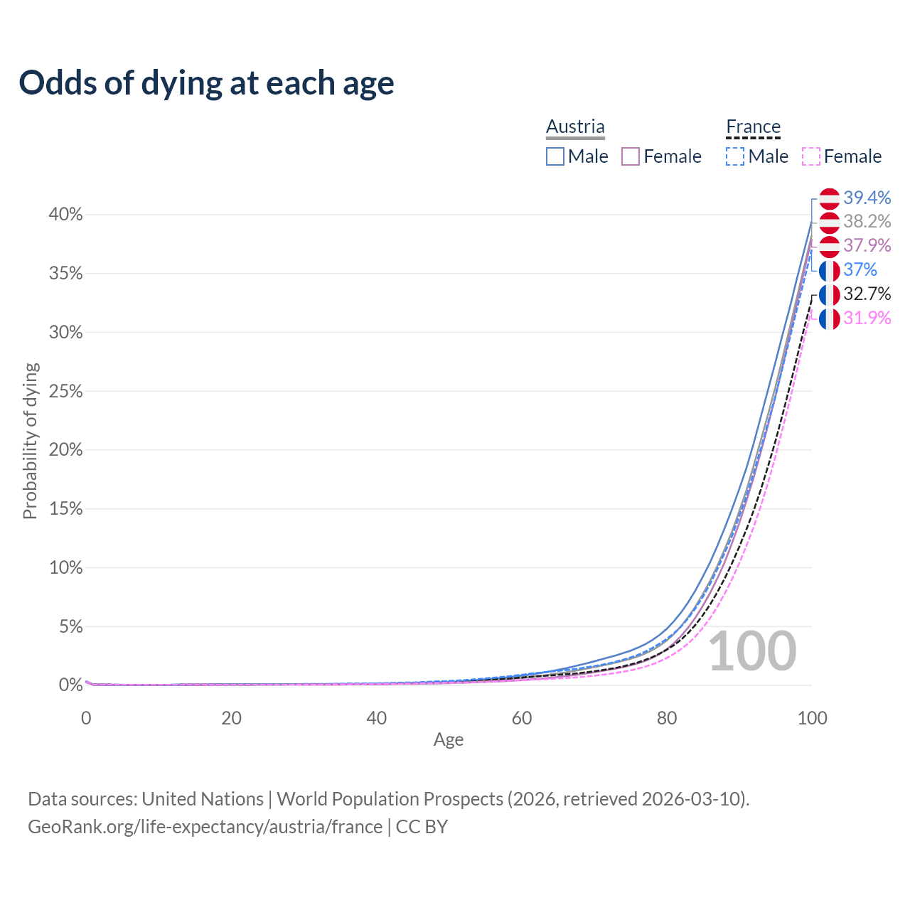 This life expectancy calculator shows the odds of living to 100, 95, 90, and below based on current age for both males and females in Austria and France, along with mean and median age of death. The calculations are based on the 2026 life tables (actuarial tables) from the UN World Population Prospects.