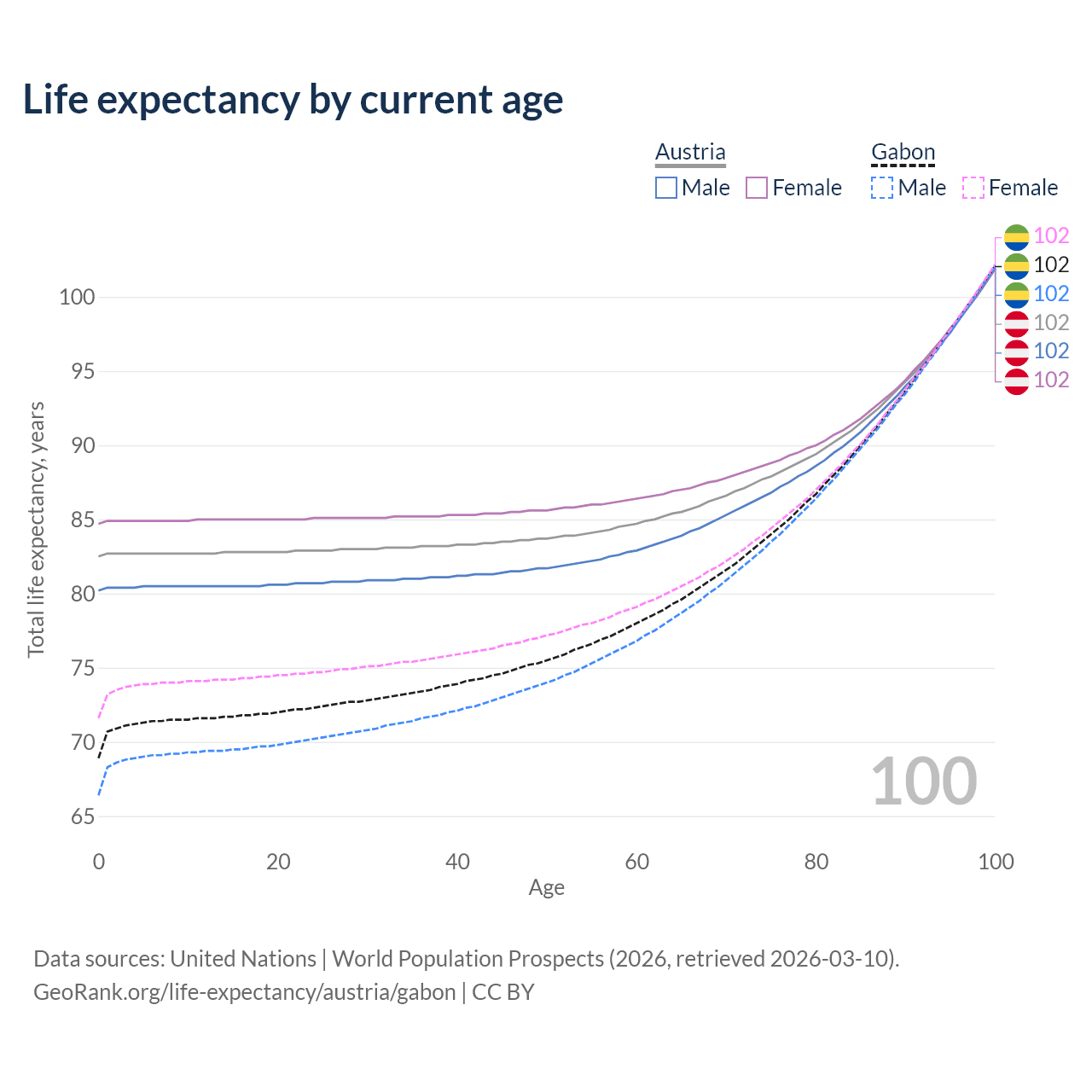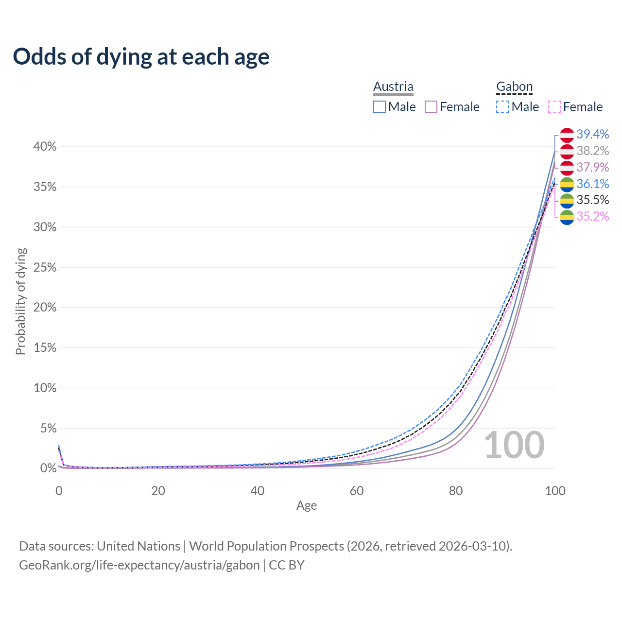 This life expectancy calculator shows the odds of living to 100, 95, 90, and below based on current age for both males and females in Austria and Gabon, along with mean and median age of death. The calculations are based on the 2026 life tables (actuarial tables) from the UN World Population Prospects.