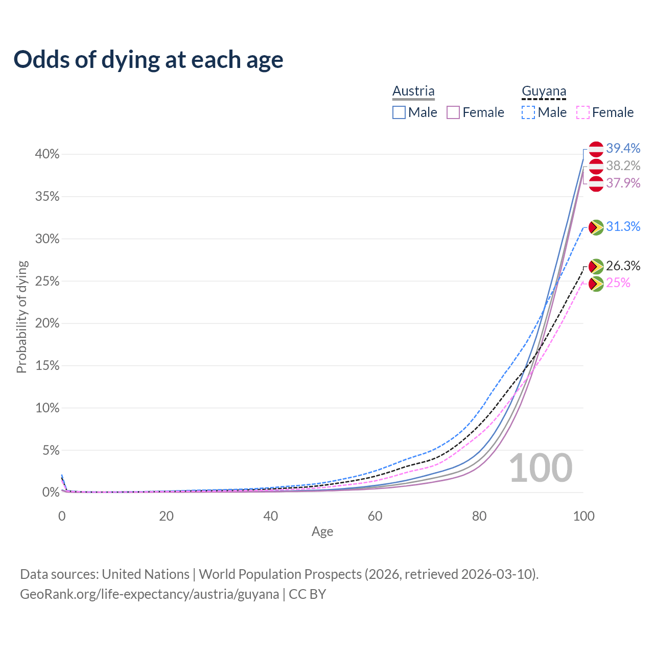 This life expectancy calculator shows the odds of living to 100, 95, 90, and below based on current age for both males and females in Austria and Guyana, along with mean and median age of death. The calculations are based on the 2026 life tables (actuarial tables) from the UN World Population Prospects.
