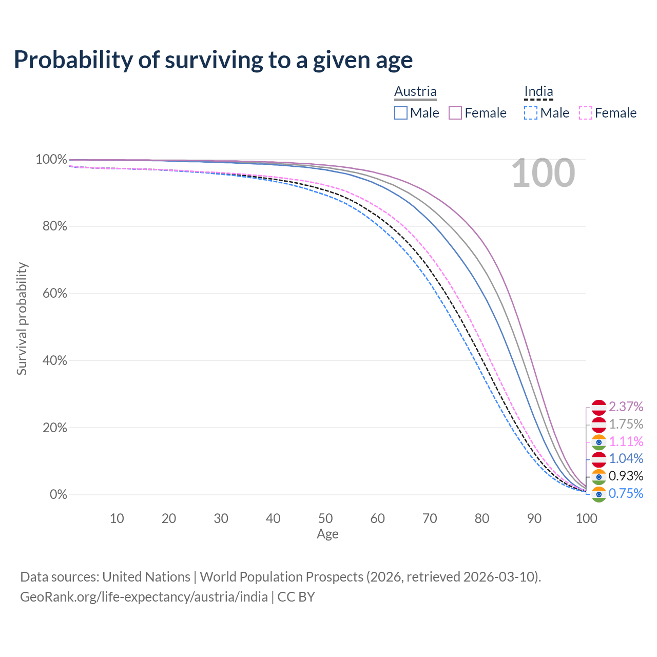 This life expectancy calculator shows the odds of living to 100, 95, 90, and below based on current age for both males and females in Austria and India, along with mean and median age of death. The calculations are based on the 2026 life tables (actuarial tables) from the UN World Population Prospects.