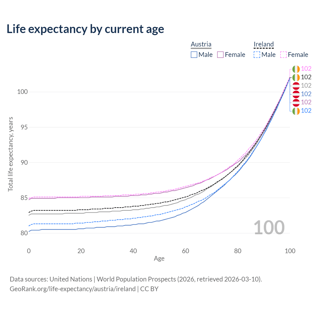 This life expectancy calculator shows the odds of living to 100, 95, 90, and below based on current age for both males and females in Austria and Ireland, along with mean and median age of death. The calculations are based on the 2026 life tables (actuarial tables) from the UN World Population Prospects.