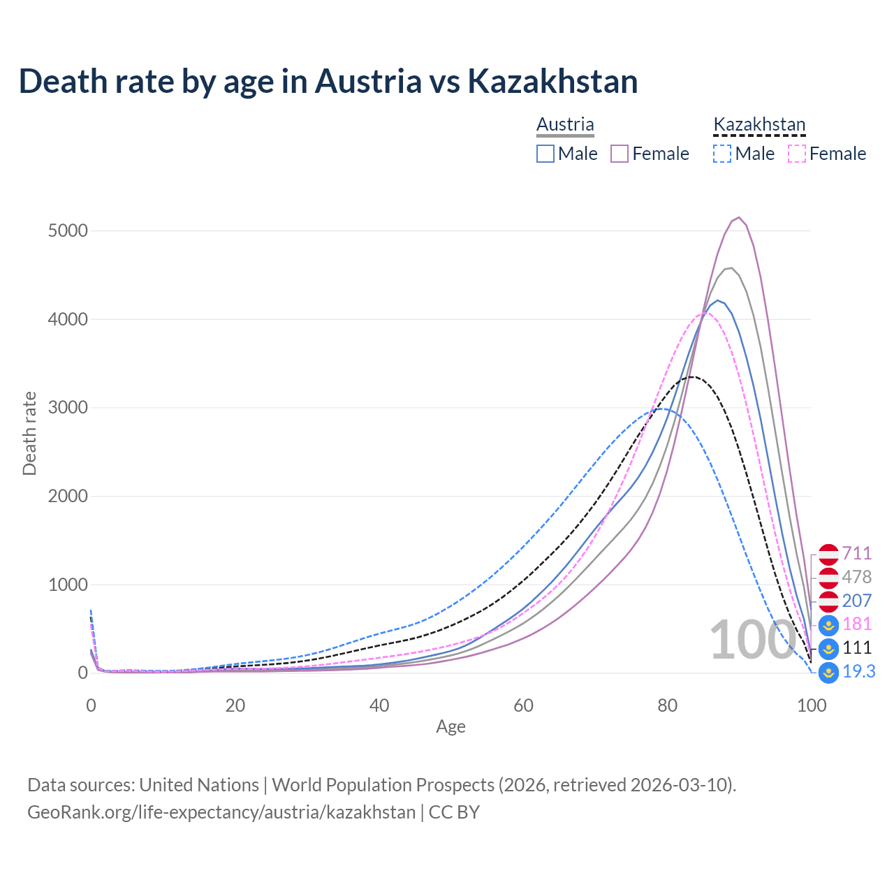 In Austria, the most common age of death is 89, compared to 84 in Kazakhstan. The median age of death is 85.6 in Austria and 78.6 in Kazakhstan, meaning only half of each cohort is expected to live past that age.