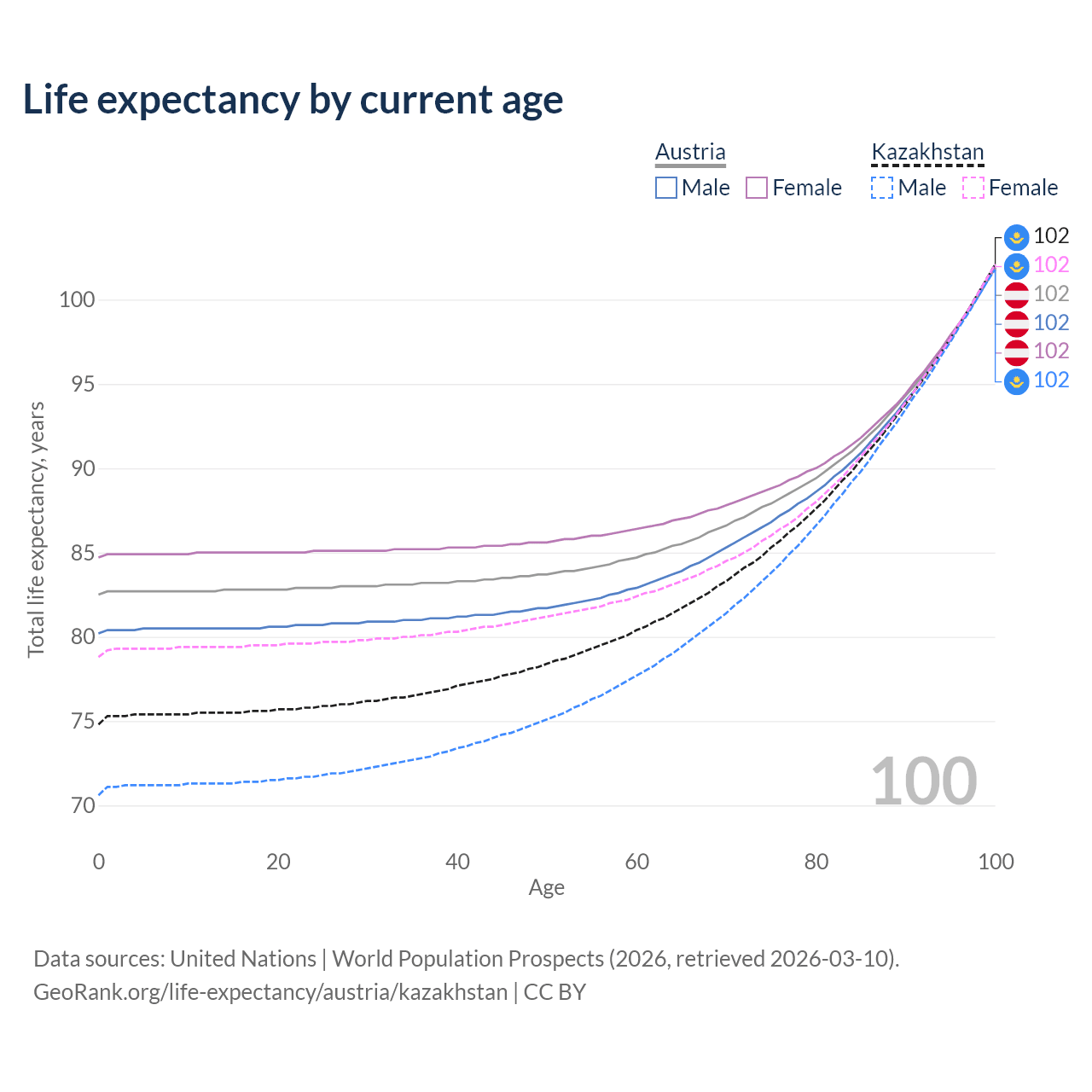 This life expectancy calculator shows the odds of living to 100, 95, 90, and below based on current age for both males and females in Austria and Kazakhstan, along with mean and median age of death. The calculations are based on the 2026 life tables (actuarial tables) from the UN World Population Prospects.