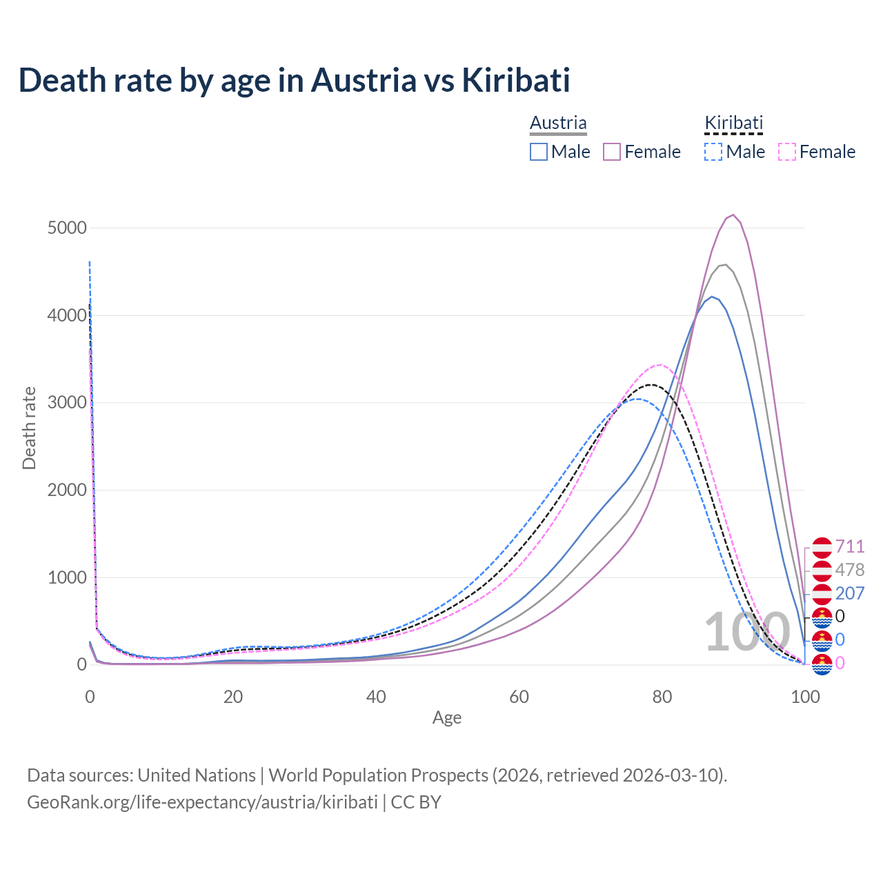 In Austria, the most common age of death is 89, compared to 0 in Kiribati. The median age of death is 85.6 in Austria and 73.1 in Kiribati, meaning only half of each cohort is expected to live past that age.