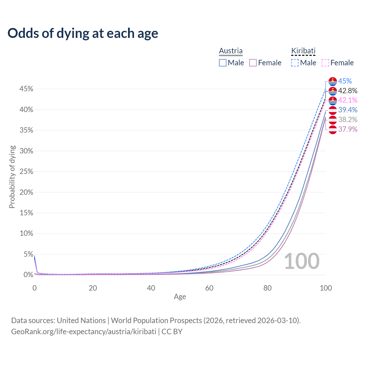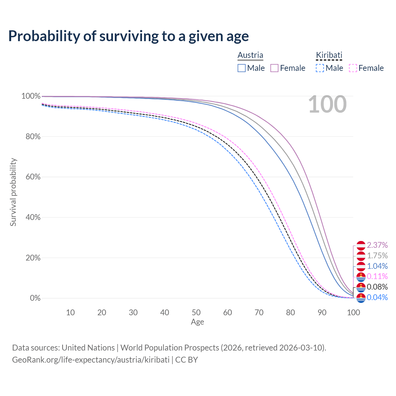This life expectancy calculator shows the odds of living to 100, 95, 90, and below based on current age for both males and females in Austria and Kiribati, along with mean and median age of death. The calculations are based on the 2026 life tables (actuarial tables) from the UN World Population Prospects.