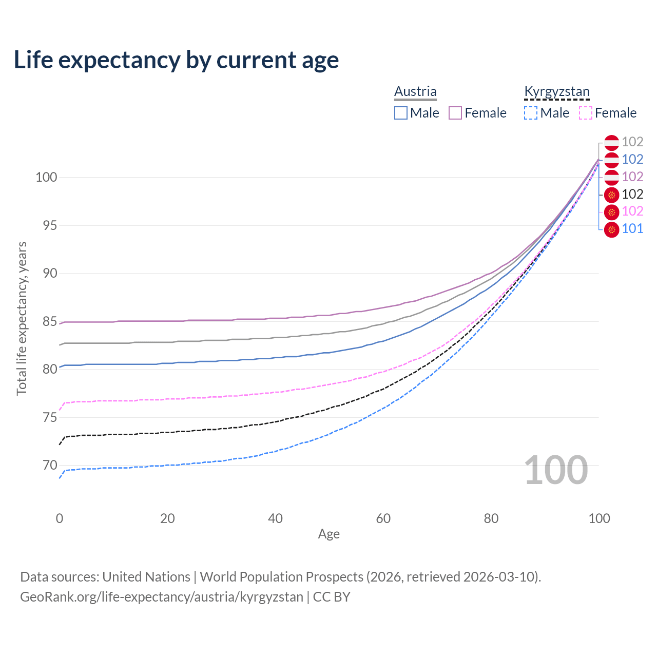 This life expectancy calculator shows the odds of living to 100, 95, 90, and below based on current age for both males and females in Austria and Kyrgyzstan, along with mean and median age of death. The calculations are based on the 2026 life tables (actuarial tables) from the UN World Population Prospects.
