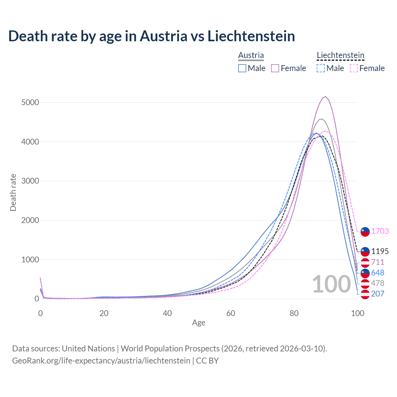 In Austria, the most common age of death is 89, compared to 89 in Liechtenstein. The median age of death is 85.6 in Austria and 86.3 in Liechtenstein, meaning only half of each cohort is expected to live past that age.