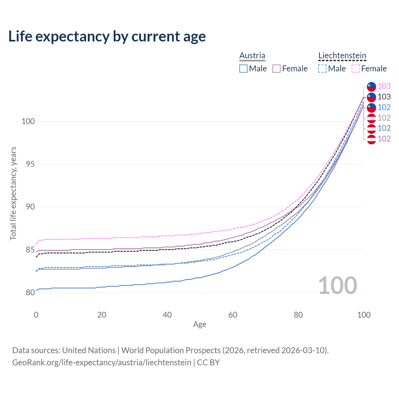 This life expectancy calculator shows the odds of living to 100, 95, 90, and below based on current age for both males and females in Austria and Liechtenstein, along with mean and median age of death. The calculations are based on the 2026 life tables (actuarial tables) from the UN World Population Prospects.