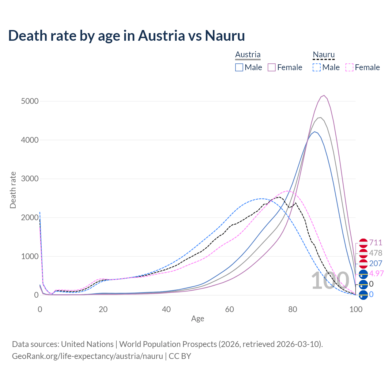 In Austria, the most common age of death is 89, compared to 76 in Nauru. The median age of death is 85.6 in Austria and 67.3 in Nauru, meaning only half of each cohort is expected to live past that age.