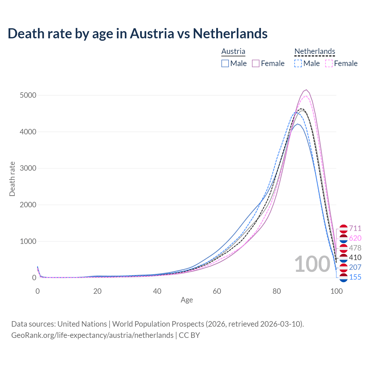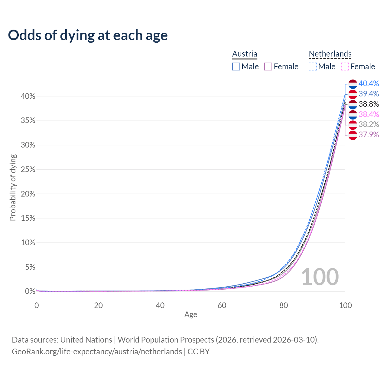 This life expectancy calculator shows the odds of living to 100, 95, 90, and below based on current age for both males and females in Austria and the Netherlands, along with mean and median age of death. The calculations are based on the 2026 life tables (actuarial tables) from the UN World Population Prospects.