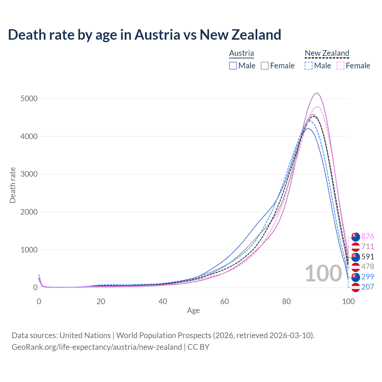 In Austria, the most common age of death is 89, compared to 89 in New Zealand. The median age of death is 85.6 in Austria and 85.8 in New Zealand, meaning only half of each cohort is expected to live past that age.