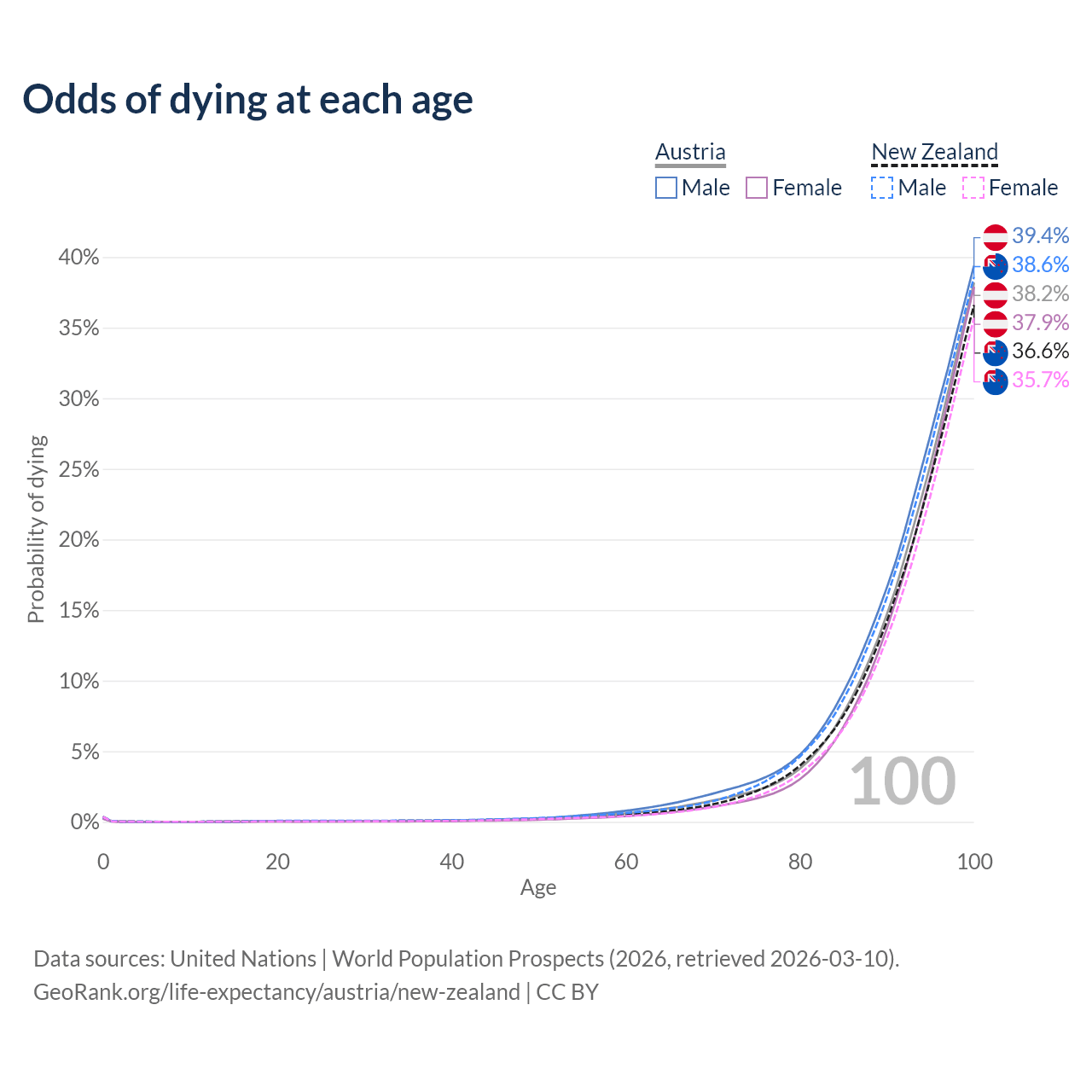 This life expectancy calculator shows the odds of living to 100, 95, 90, and below based on current age for both males and females in Austria and New Zealand, along with mean and median age of death. The calculations are based on the 2026 life tables (actuarial tables) from the UN World Population Prospects.