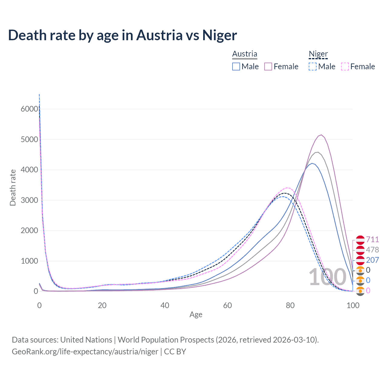 In Austria, the most common age of death is 89, compared to 0 in Niger. The median age of death is 85.6 in Austria and 71.7 in Niger, meaning only half of each cohort is expected to live past that age.