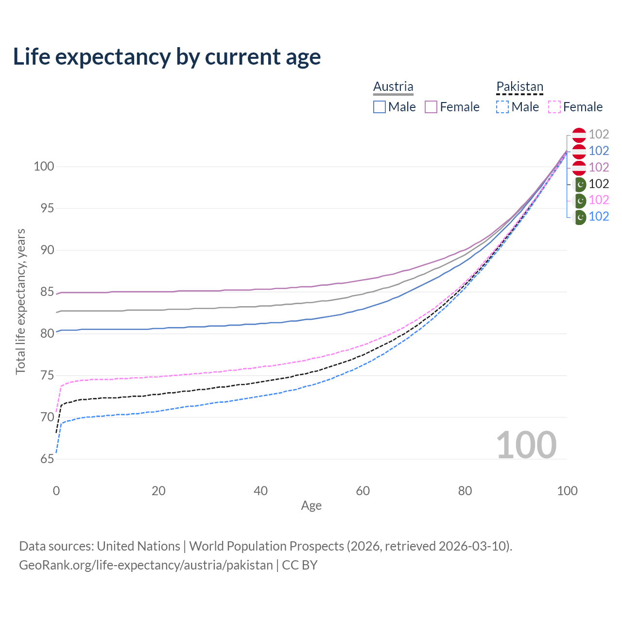 The average life expectancy at birth is 82.5 years in Austria vs 68.1 in Pakistan. Austria is ranked 28/197 by life expectancy, and Pakistan is 151/197. In Austria, the life expectancy is 80.2 years for males and 84.7 years for females. In Pakistan, it's 65.7 years for males and 70.6 years for females.