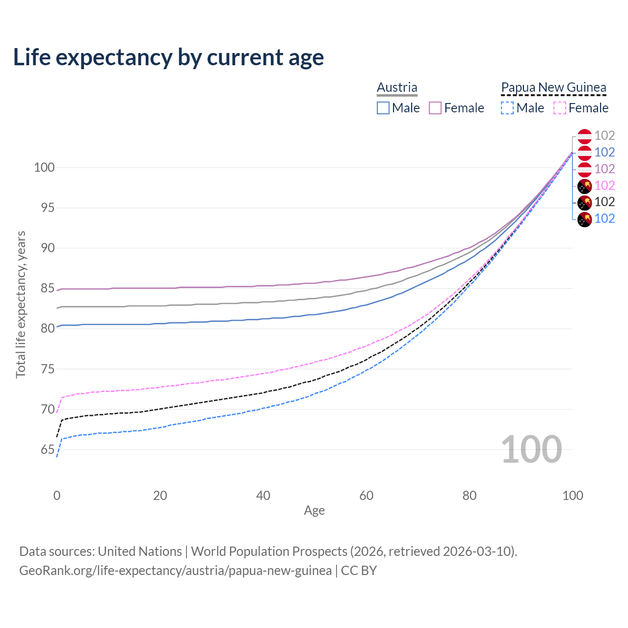 The average life expectancy at birth is 82.5 years in Austria vs 66.5 in Papua New Guinea. Austria is ranked 28/197 by life expectancy, and Papua New Guinea is 166/197. In Austria, the life expectancy is 80.2 years for males and 84.7 years for females. In Papua New Guinea, it's 64 years for males and 69.5 years for females.