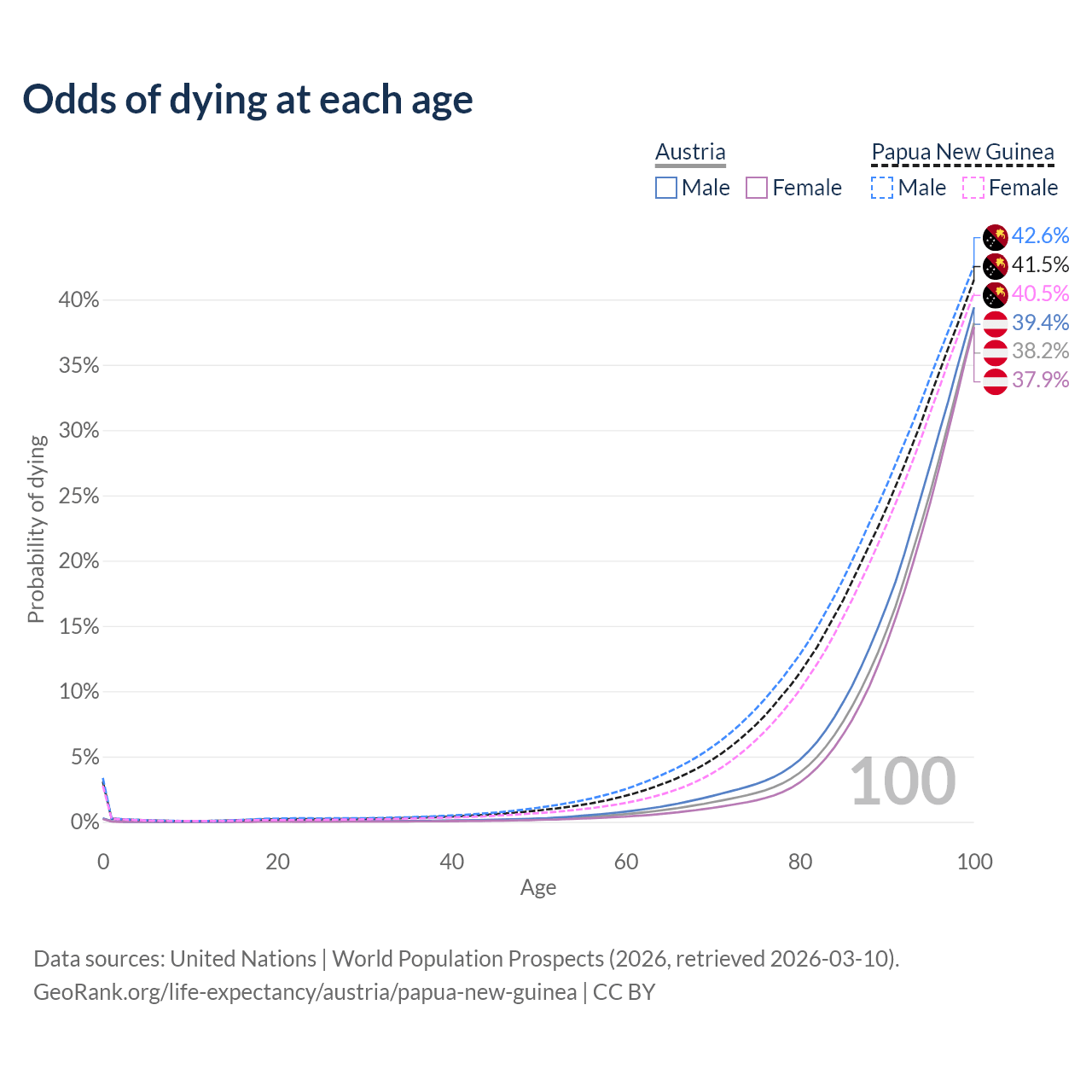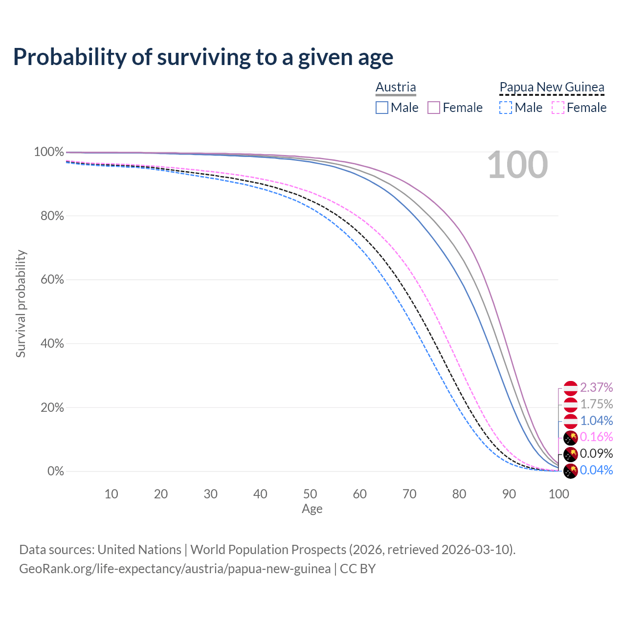 This life expectancy calculator shows the odds of living to 100, 95, 90, and below based on current age for both males and females in Austria and Papua New Guinea, along with mean and median age of death. The calculations are based on the 2026 life tables (actuarial tables) from the UN World Population Prospects.