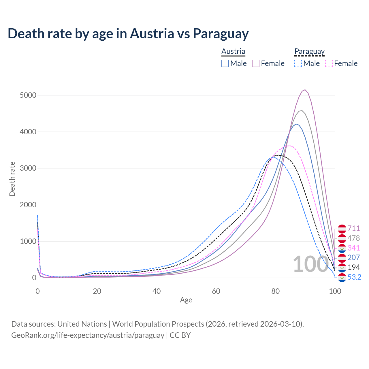 In Austria, the most common age of death is 89, compared to 81 in Paraguay. The median age of death is 85.6 in Austria and 78.4 in Paraguay, meaning only half of each cohort is expected to live past that age.