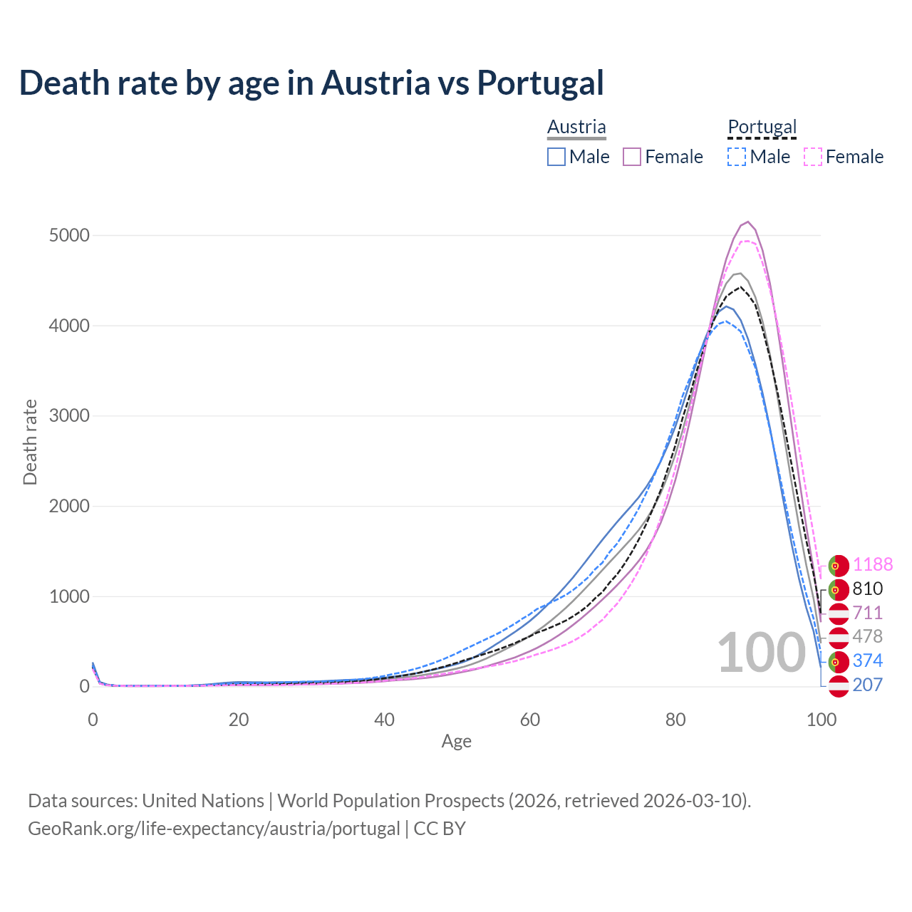 In Austria, the most common age of death is 89, compared to 89 in Portugal. The median age of death is 85.6 in Austria and 85.9 in Portugal, meaning only half of each cohort is expected to live past that age.