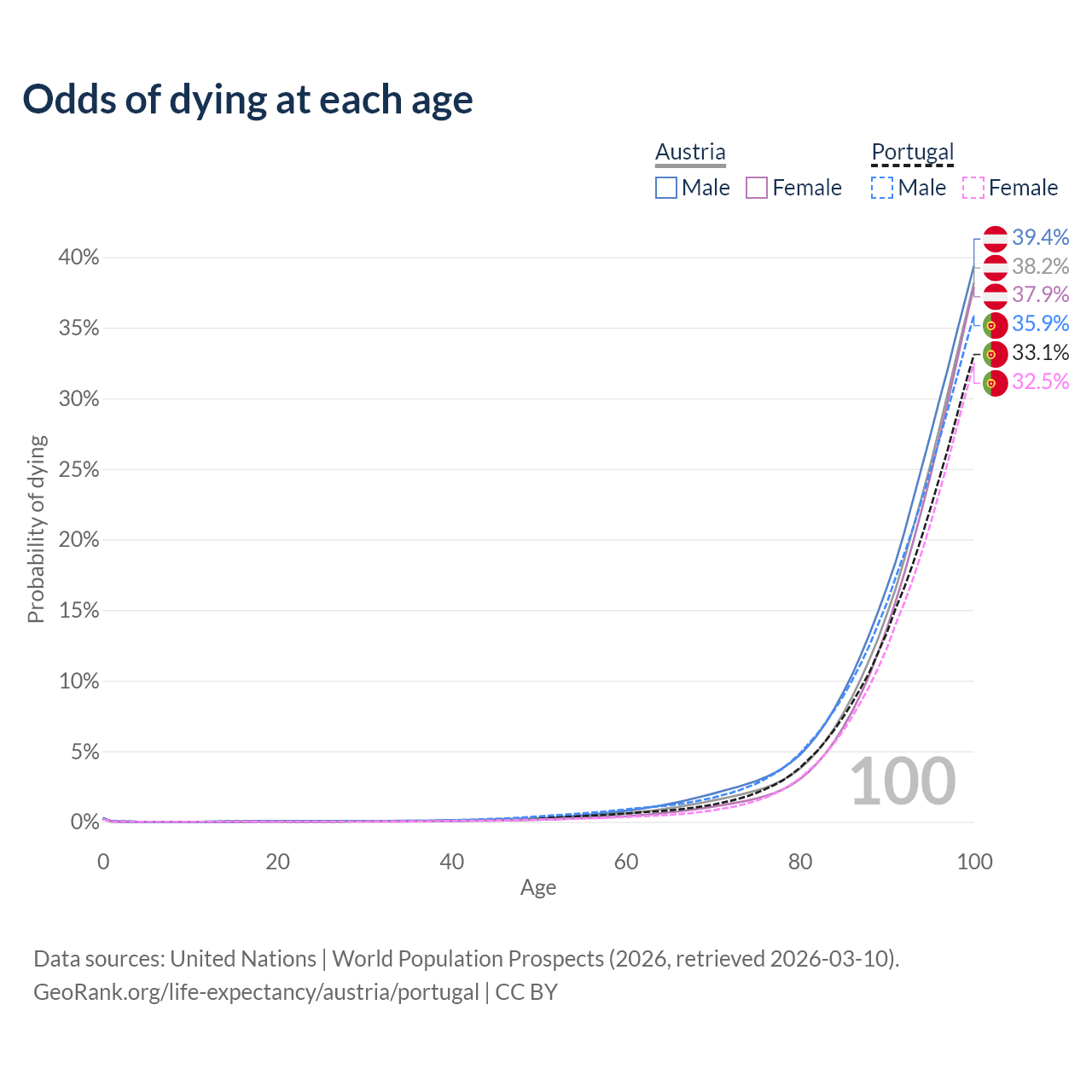 This life expectancy calculator shows the odds of living to 100, 95, 90, and below based on current age for both males and females in Austria and Portugal, along with mean and median age of death. The calculations are based on the 2026 life tables (actuarial tables) from the UN World Population Prospects.