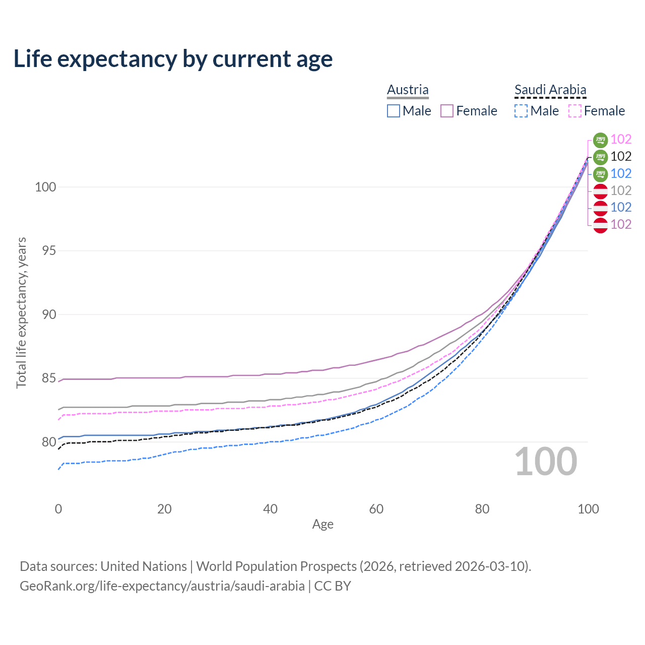 This life expectancy calculator shows the odds of living to 100, 95, 90, and below based on current age for both males and females in Austria and Saudi Arabia, along with mean and median age of death. The calculations are based on the 2026 life tables (actuarial tables) from the UN World Population Prospects.