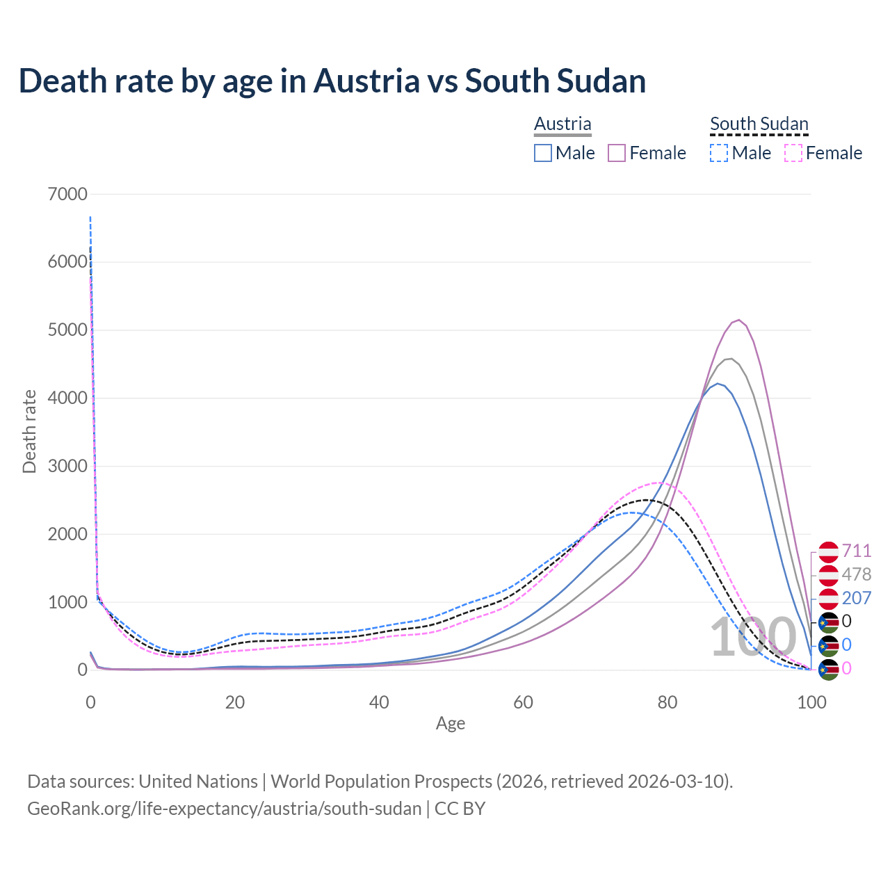 In Austria, the most common age of death is 89, compared to 0 in South Sudan. The median age of death is 85.6 in Austria and 67.5 in South Sudan, meaning only half of each cohort is expected to live past that age.