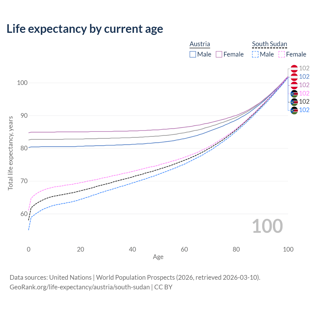 This life expectancy calculator shows the odds of living to 100, 95, 90, and below based on current age for both males and females in Austria and South Sudan, along with mean and median age of death. The calculations are based on the 2026 life tables (actuarial tables) from the UN World Population Prospects.