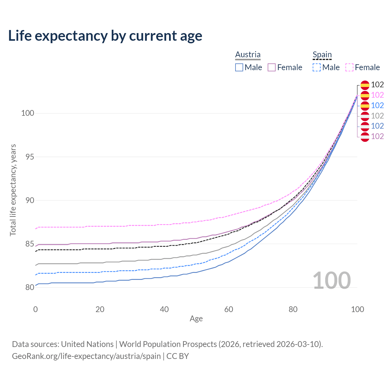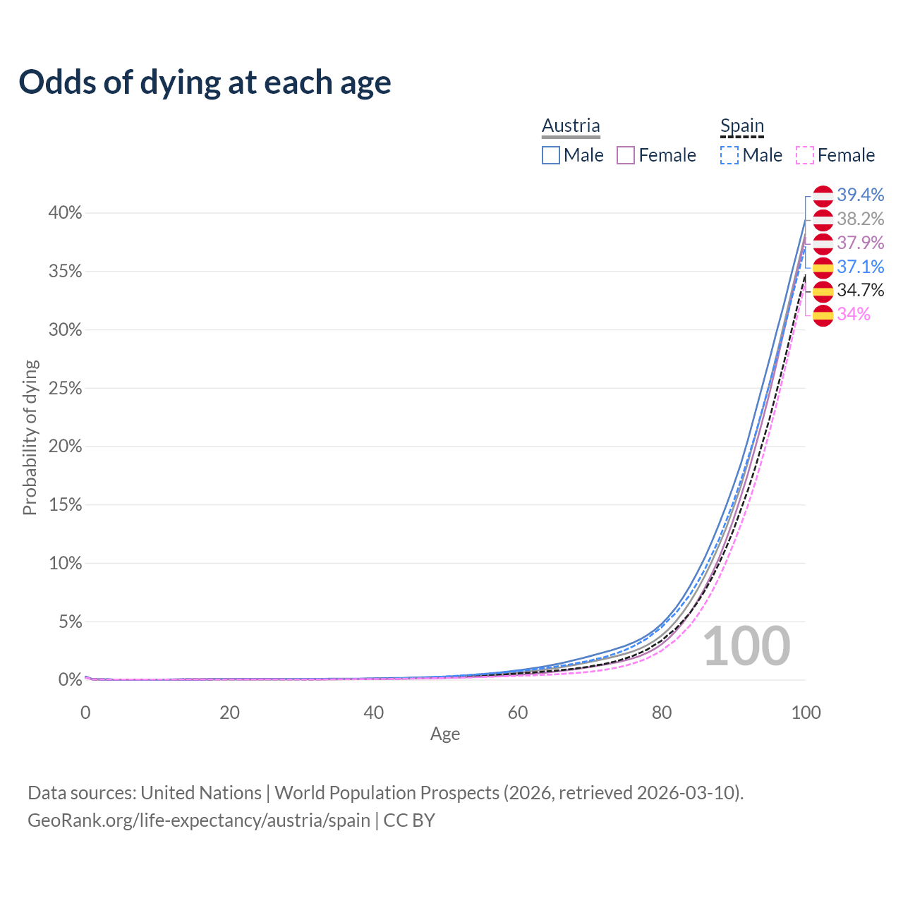 This life expectancy calculator shows the odds of living to 100, 95, 90, and below based on current age for both males and females in Austria and Spain, along with mean and median age of death. The calculations are based on the 2026 life tables (actuarial tables) from the UN World Population Prospects.