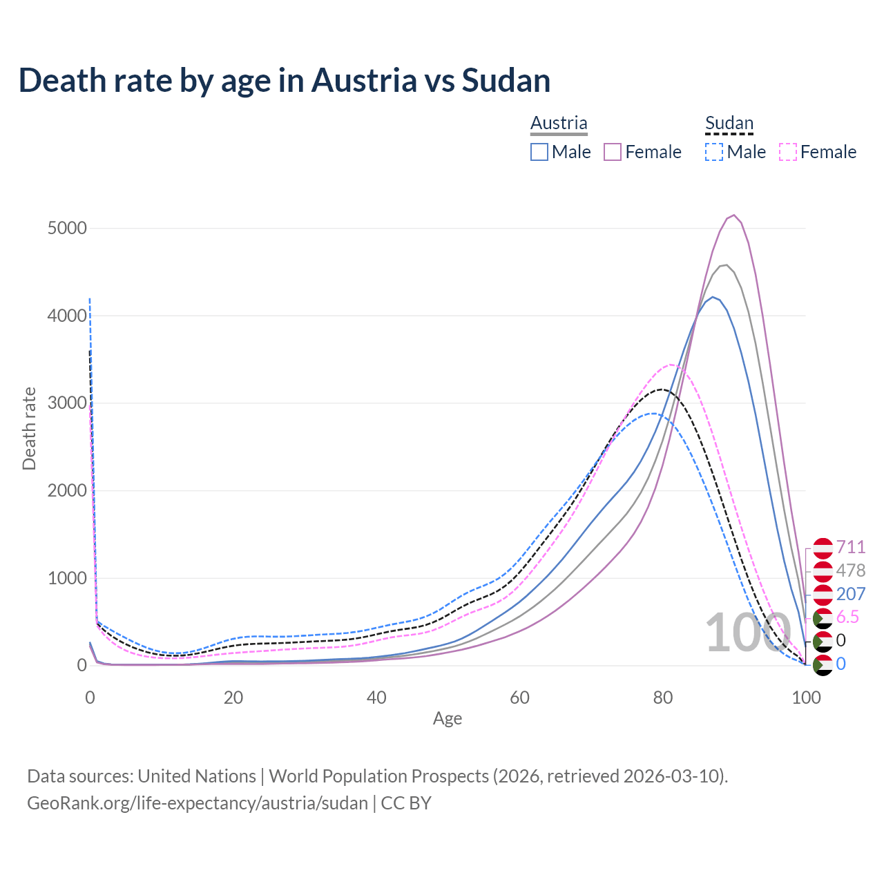 In Austria, the most common age of death is 89, compared to 0 in Sudan. The median age of death is 85.6 in Austria and 74.1 in Sudan, meaning only half of each cohort is expected to live past that age.