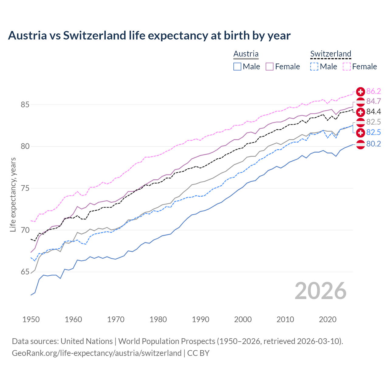 The average life expectancy at birth is 82.5 years in Austria vs 84.4 in Switzerland. Austria is ranked 28/197 by life expectancy, and Switzerland is 6/197. In Austria, the life expectancy is 80.2 years for males and 84.7 years for females. In Switzerland, it's 82.5 years for males and 86.2 years for females.