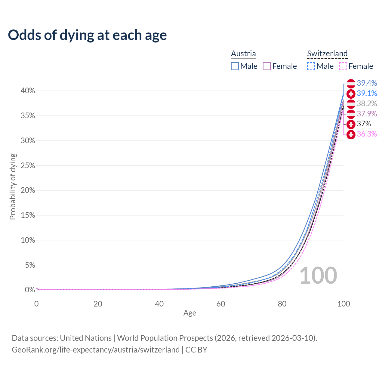 This life expectancy calculator shows the odds of living to 100, 95, 90, and below based on current age for both males and females in Austria and Switzerland, along with mean and median age of death. The calculations are based on the 2026 life tables (actuarial tables) from the UN World Population Prospects.