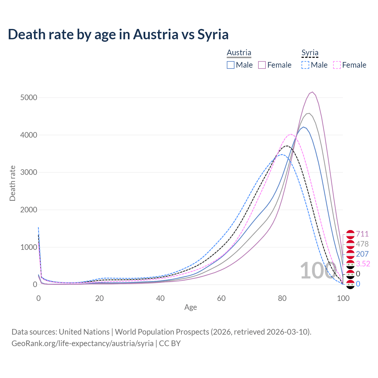 In Austria, the most common age of death is 89, compared to 82 in Syria. The median age of death is 85.6 in Austria and 77.7 in Syria, meaning only half of each cohort is expected to live past that age.